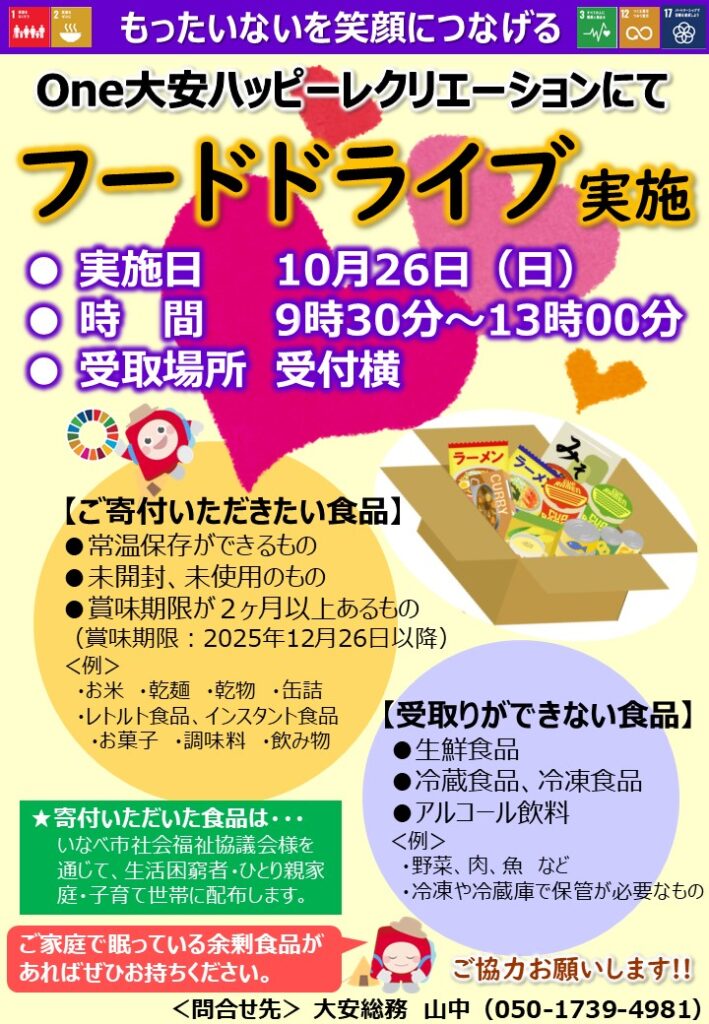 来る10月26日(日)開催の『One大安ハッピーレクリエーション』において、フードドライブを実施します!!寄付いただいた食品は、いなべ市社会福祉協議会様を通じて、生活困窮者、ひとり親家族・子育て世帯に配布されます。