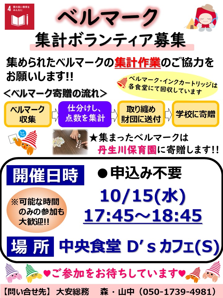 ●【募集】10/15(水)ベルマーク集計ボランティア